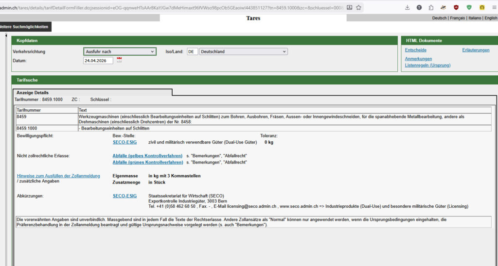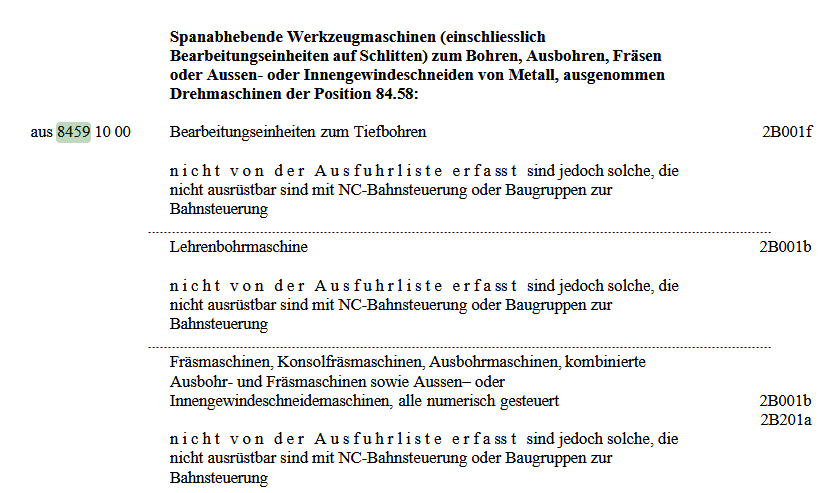 Im vorliegenden Beispiel lautet die Zolltarifnummer der CNC-Fräsmaschine 8459.1000; eine EKN ist nicht aufgeführt jedoch der Hinweis bewilligungspflichtig, weshalb die EKN mittels Umschlüsselung gemäss Punkt 3.2 zu ermitteln ist.