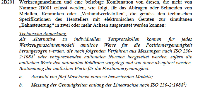 Die Anhänge 1 und 2 GKV enthalten eine international harmonisierte, technisch strukturierte Güterliste, welche auf verschiedenen Exportkontrollregimen (u.a. Wassenaar-Arrangement, MTCR, NSG, Australiengruppe)[3] beruht. Die einzelnen Güterpositionen sind anhand von präzise definierten technischen Merkmalen, Leistungsparametern, Materialien, Funktionen sowie Konstruktionsmerkmalen beschrieben und mittels fünfstelliger Exportkontrollnummern (EKN) systematisch gegliedert.
